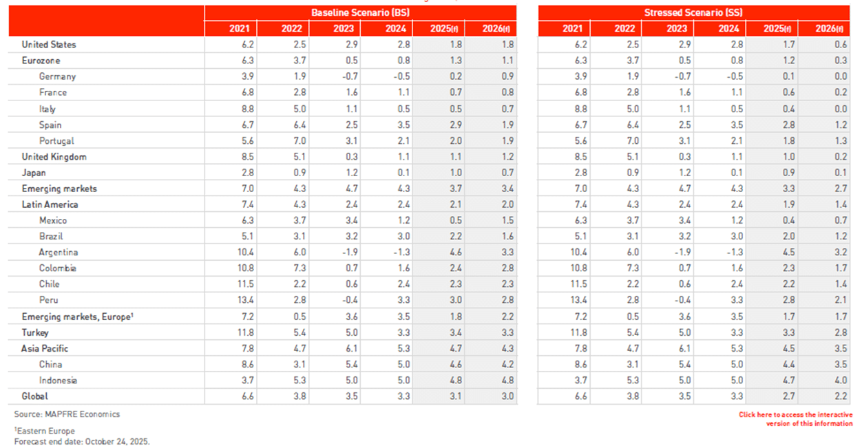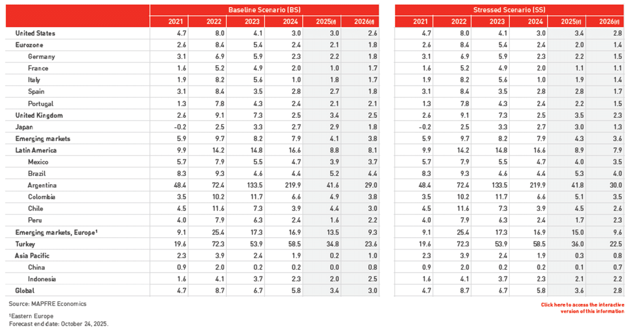 The complete analysis of the global economic environment update can be found in the report 2025 Economic and Industry Outlook: Fourth-Quarter Forecast Update, prepared by MAPFRE Economics, which is available at the following link: