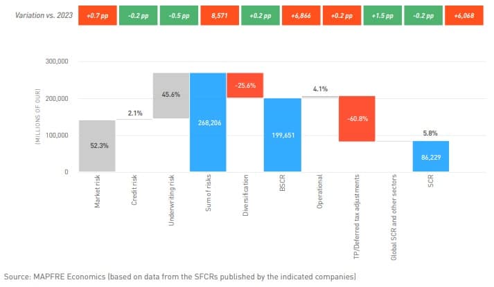 An aggregate analysis of the capital structure shows that eligible own funds amounted to 493 billion euros in 2024, 2.5% less than in 2023, while the total Solvency Capital Requirement (SCR) increased by 4.2% to 236.6 billion euros. This combination explains the overall reduction in the average coverage ratio. Covéa and MAPFRE recorded the highest relative weight of own funds compared with technical provisions in 2024 (33.6% and 33.0%, respectively) and compared to assets (23.4% and 20.4%).