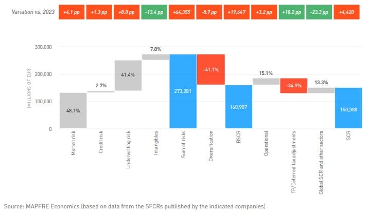 As shown in Chart 4, the groups using partial or full internal models experienced more notable variations: market risk increased by 4.1 pp and underwriting risk by 8.0 pp, while the “other risks” component decreased significantly (-13.4 pp). Although market risk increased more among groups using internal models (+4.1 pp) than among those applying the standard formula (+0.7 pp), its total weight remains higher under the standard formula, at 52.3% compared to 48.1% for internal models. A decrease was also observed in diversification profits (-8.7 pp), implying a smaller overall reduction in the total capital requirement and an increase in operational risk (+3.2 pp). Finally, loss-absorbing capacity adjustments increased by 10.2 pp, although in this case they only reflect the modeled effects not incorporated into other components of the SCR. Taken together, these variations illustrate how the choice of calculation method influences capital structure and sensitivity to different types of risk.