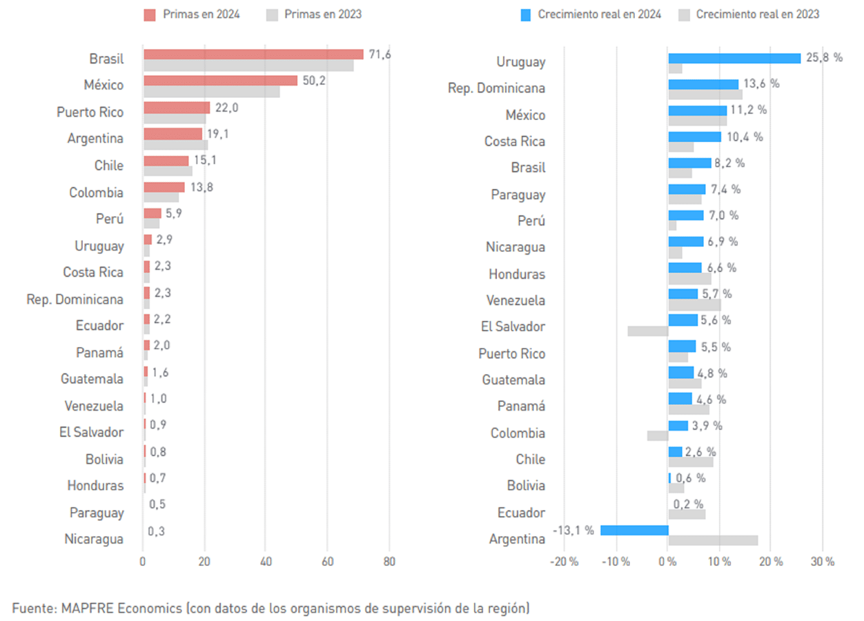 Por otro lado, el desempeño de la industria aseguradora en Latinoamérica en 2024, junto con una inflación moderada en la mayoría de los países, ha dado lugar a un crecimiento real de las primas en casi todos los mercados, siendo Argentina el único que registró un decrecimiento de los ingresos por primas del -13,1% en términos reales (véase la Gráfica 2).