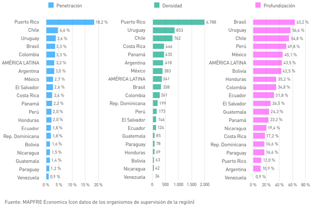 En cuanto a las tendencias estructurales, la Gráfica 3 ilustra la comparativa entre los distintos países de la región en términos de penetración, densidad y profundización, indicadores que permiten medir el grado de avance y desarrollo de los mercados aseguradores latinoamericanos.