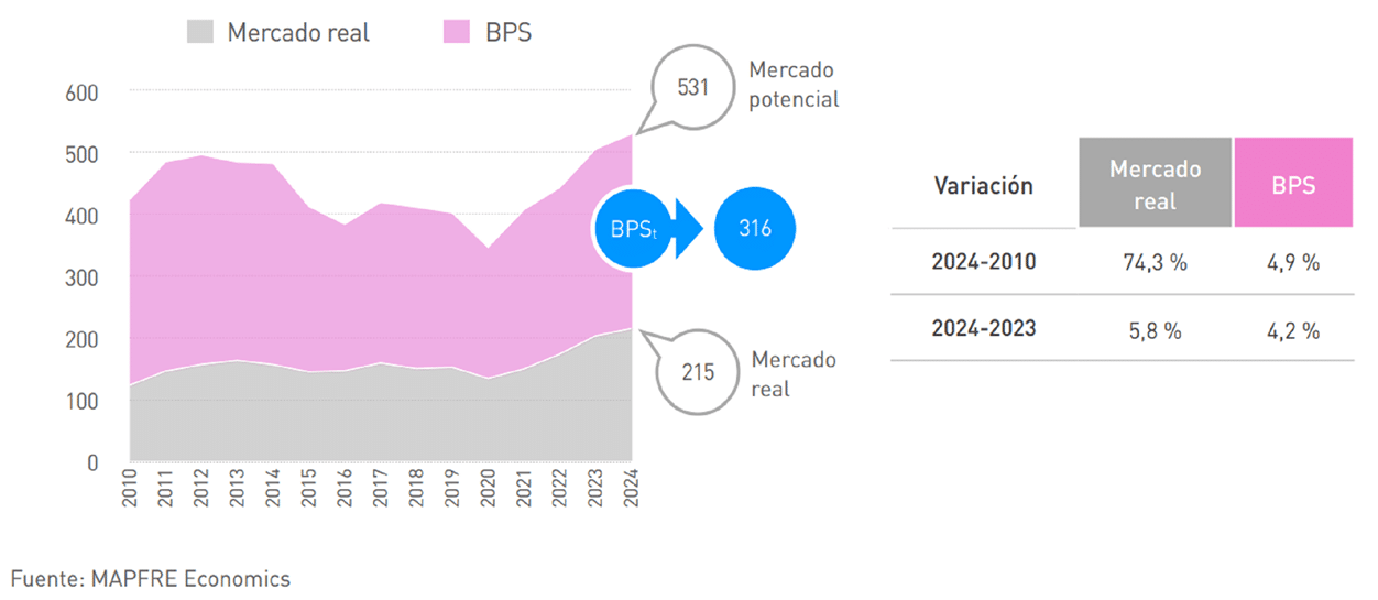 Por lo que se refiere a la Por lo que se refiere a la Brecha de Protección del Seguro (BPS) (diferencia entre la cobertura de seguros que es económicamente necesaria y beneficiosa para la sociedad, y la cantidad de dicha cobertura efectivamente adquirida), la estimación de este indicador para el mercado asegurador de América Latina se situó en 2024, en 315,9 millardos de dólares, lo que supuso un incremento del 4,2% respecto a la estimación realizada para 2023. Por tratarse de una medición de naturaleza estructural, la composición de la BPS a lo largo de los últimos años no muestra cambios significativos respecto a nuestro reporte anterior, confirmándose el predominio de los seguros de Vida en su conformación.