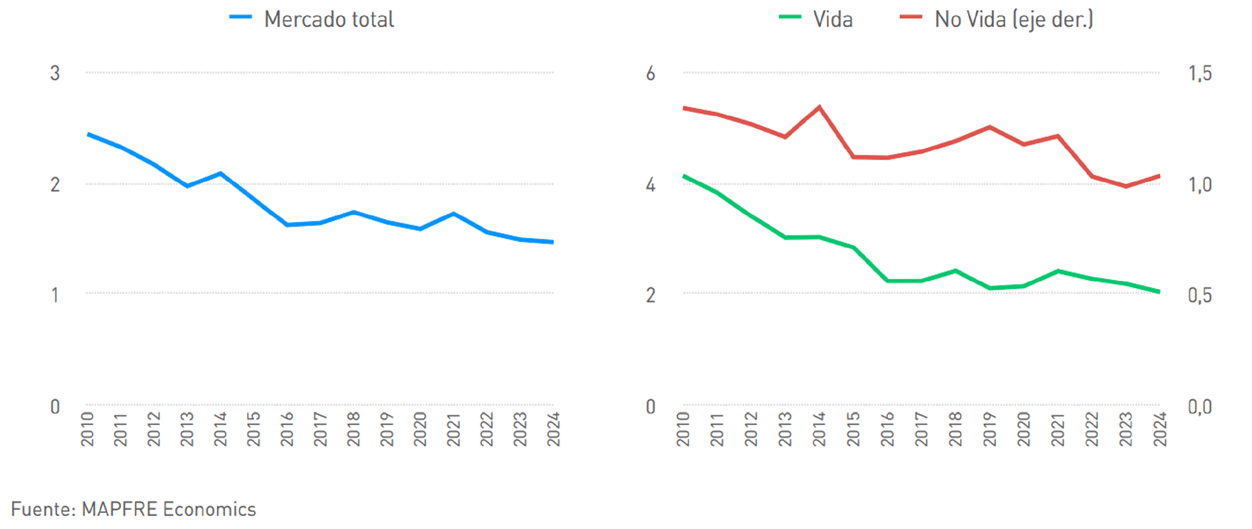 El índice de profundización del seguro (relación entre las primas de los seguros de Vida respecto a las primas totales) se situó en 43,5% en 2024, 1,2 puntos porcentuales por encima del nivel registrado en 2023, debido al mayor dinamismo del segmento de Vida. En el análisis por países, entre 2023 y 2024 se observaron retrocesos en Argentina, Costa Rica, El Salvador, Guatemala y Panamá. Desde una perspectiva de medio plazo (2010-2023), el indicador registra una mejora con un aumento acumulado de 2,8 pp.