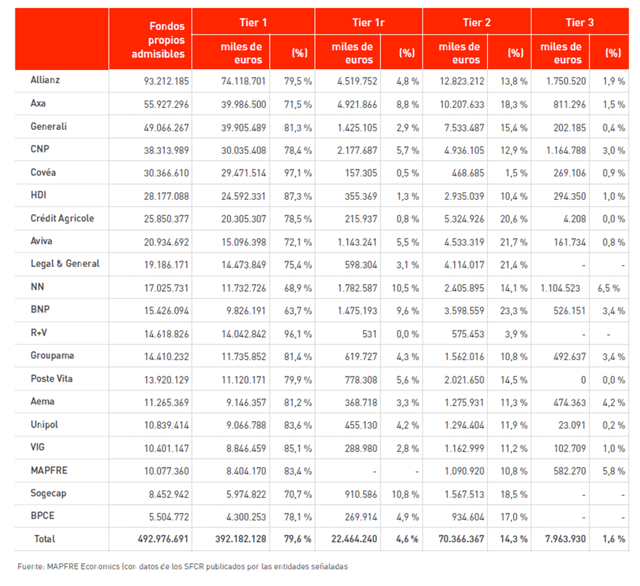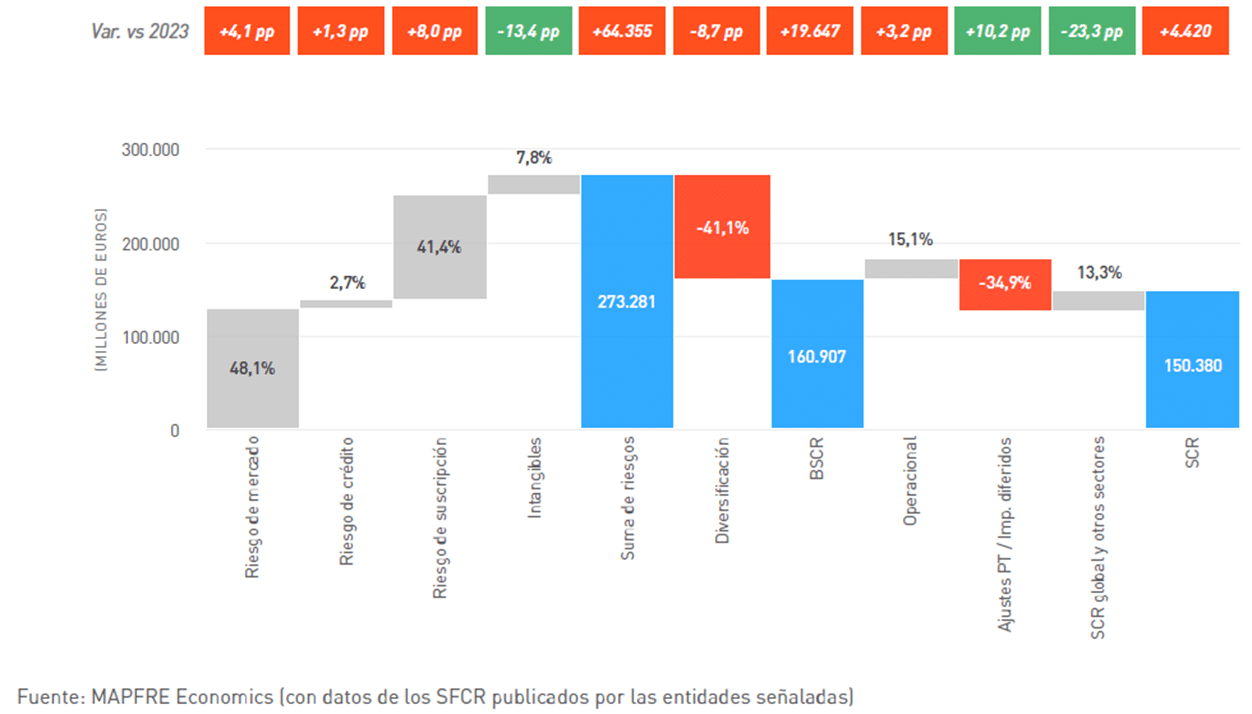 El análisis agregado de la estructura de capital muestra que los fondos propios admisibles ascendieron a 493.000 millones de euros en 2024, un 2,5% menos que en 2023, mientras que el requerimiento total de solvencia (SCR) aumentó un 4,2%, hasta 236.600 millones de euros. Esta combinación explica la reducción general del ratio medio de cobertura. Covéa y MAPFRE presenta el mayor peso relativo de los fondos propios respecto a las provisiones técnicas en 2024 (33,6% y 33,0% respectivamente) y respecto a los activos (23,4% y 20,4%).