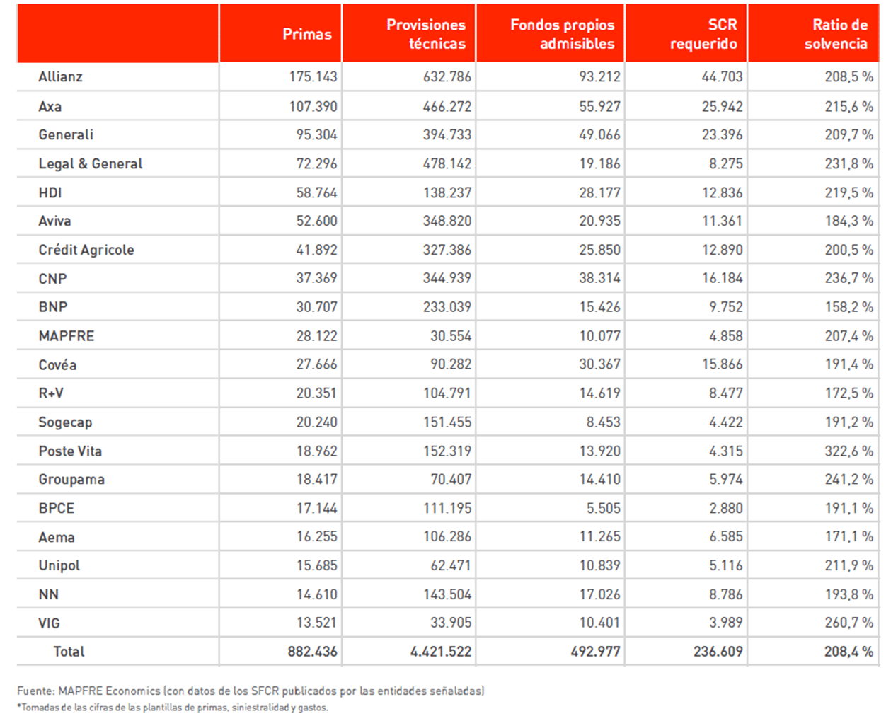 Primas y ratios de Solvencia de los principales